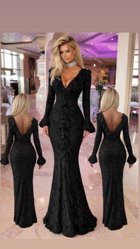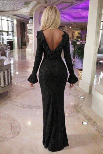 • İthal güpür kumaş fırfır detay maksi boy elbise
